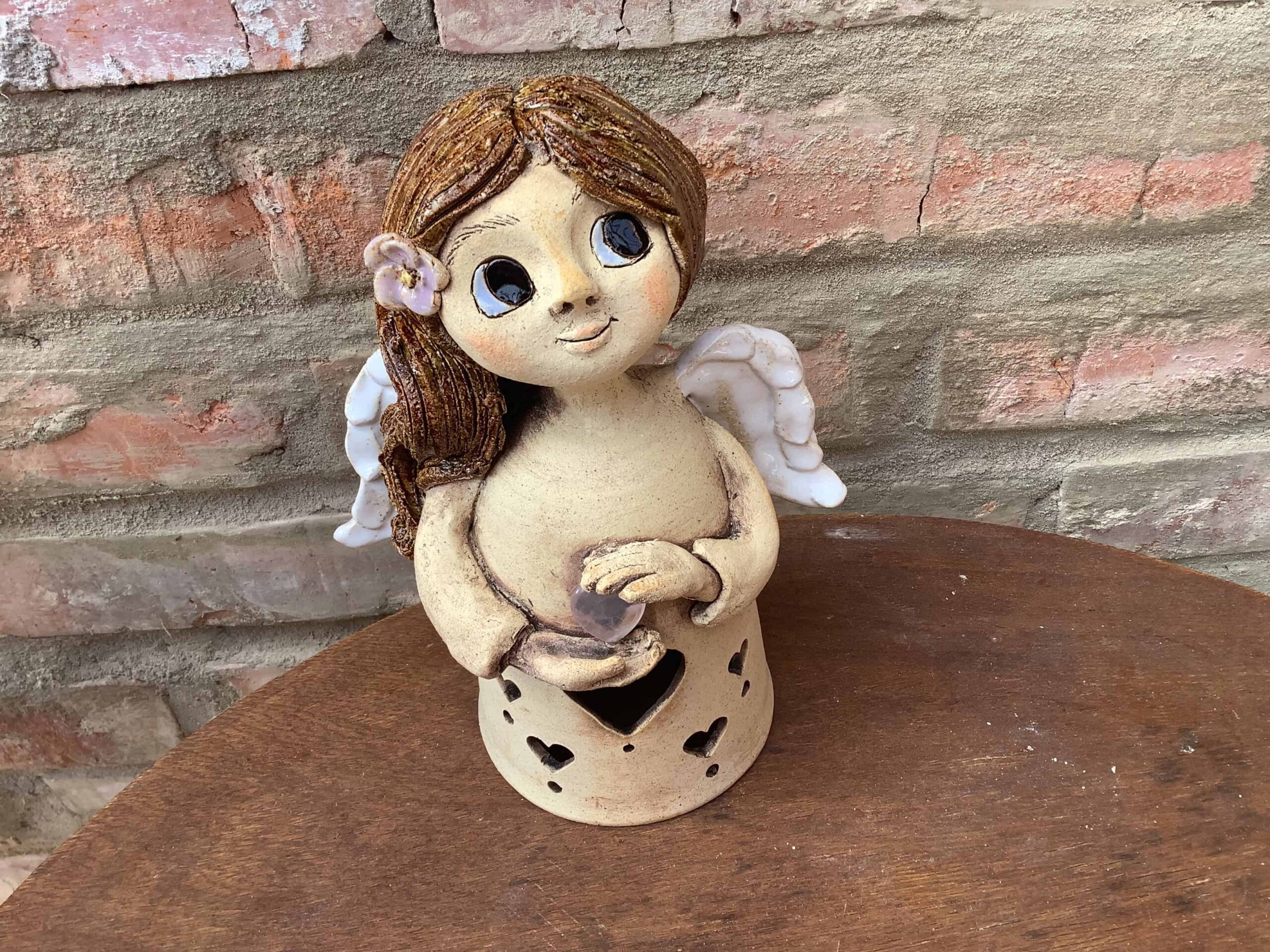 Andílek zvoneček vysoký 8-10cm, dekorovám srdíčkem nebo květinkou, s ouškem k zavěšení.