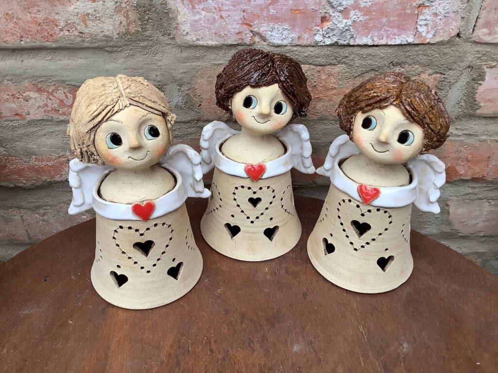 Lampičku využijí především milovníci svíček a světýlek. Andílek je ručně vytočený na hrnčířském kruhu a poté domodelován ručně. Má srdce na hrudi. Jeho tělo je děrováno dekorem srdíček a teček, kterými při zapálení svíčky krásně proniká světlo. Vysoký je cca 20 cm Součástí je i keramická mistička pod čajovou svíčku