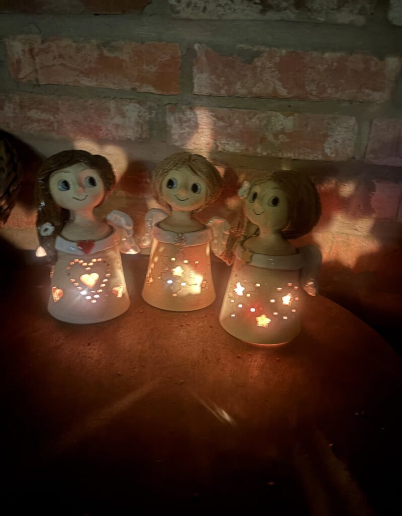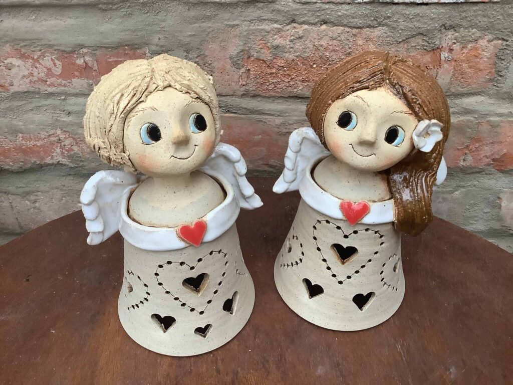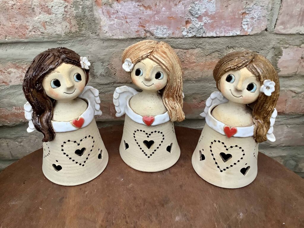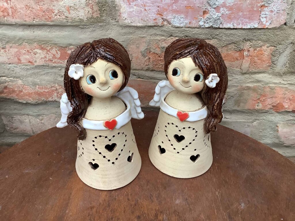 Lampičku využijí především milovníci svíček a světýlek. Andělka je ručně vytočená na hrnčířském kruhu a poté domodelovaná ručně. Má srdce na lemu šatů a ve vlasech květ. Její tělo je děrováno dekorem srdíček a teček, kterými při zapálení svíčky krásně proniká světlo. Vysoká je cca 20cm. Můžete vybírat z různych variant po kliknutí na tlačítko "koupit". Andělku si kupujete tu, kterou si zvolíte ve variantě. Součástí je i keramická miska pod čajovou svíčku