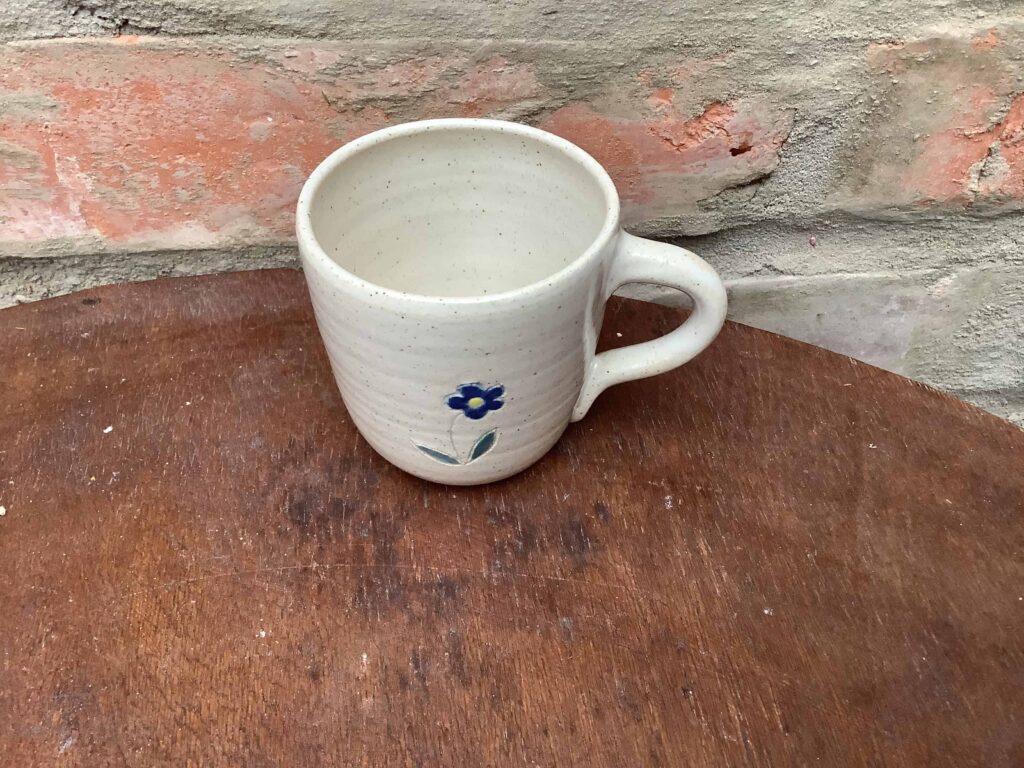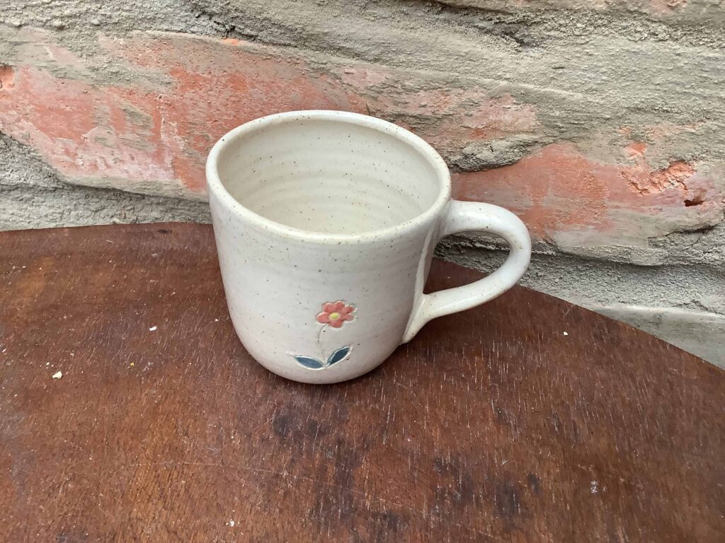 Hrnicek o objemu 180 ml s dekorací modelovaného květu. Celoglazovaný. Růžový sleva kvůli malinký bublinkam v růžové glazuře