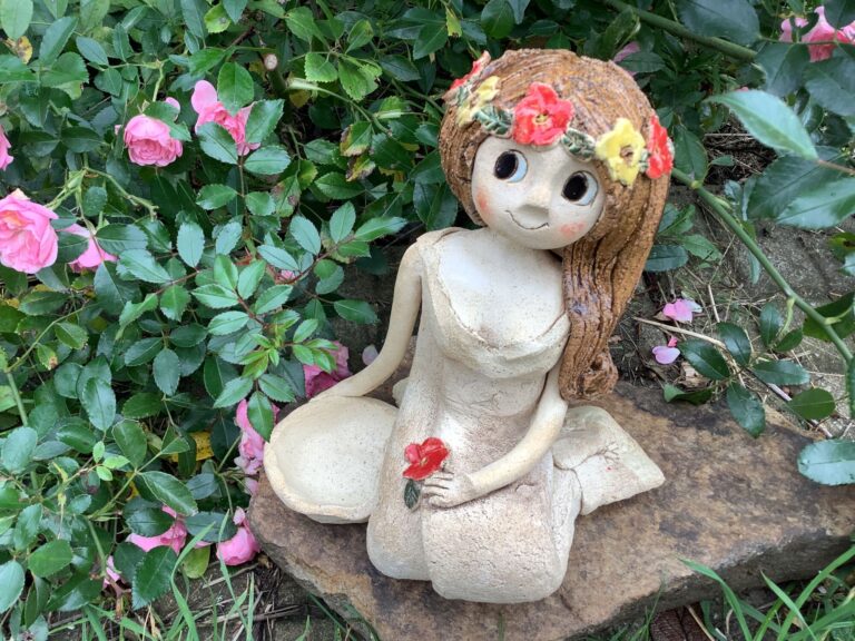 Klečící víla s věnečkem červených a žlutých kvítků ve vlasech. Vedle sebe drží misku na čajovou svíčku, která vám zpříjemní atmosféru zejména na podzim a v zimě. Výška cca 18 cm, vhodná do bytu, domu, na terasu či zahradu. V zimě doporučuji schovat pod střechu.