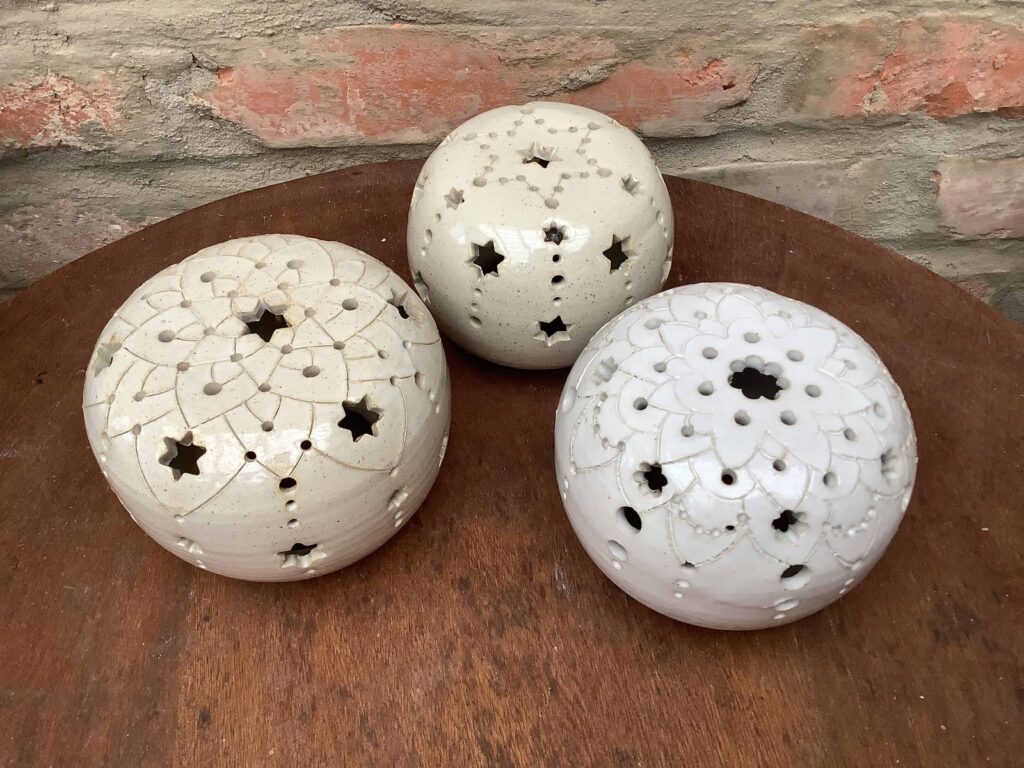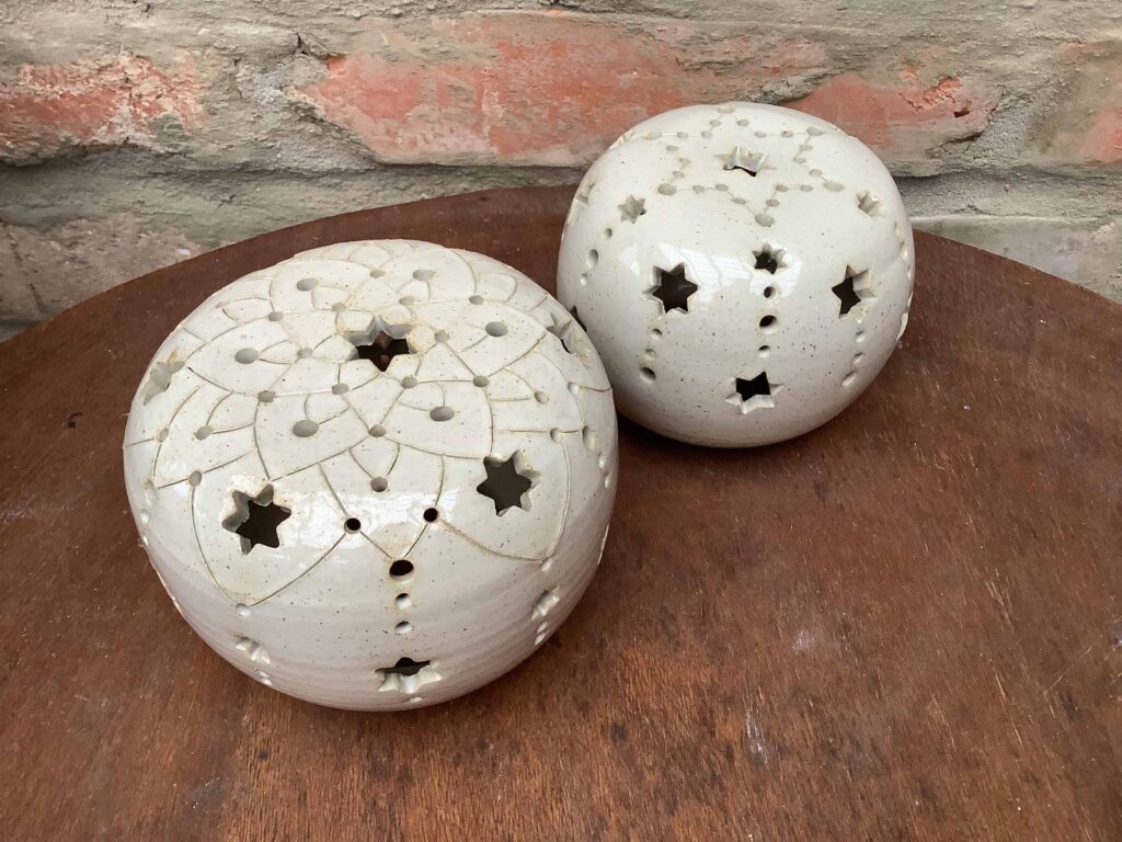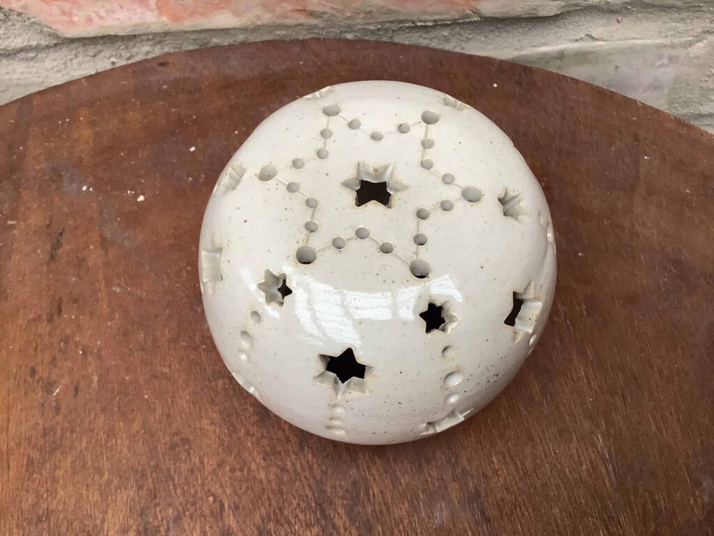 ručně točená lampička ve tvaru koule s motivem hvězdy v průřezu. Glazována bílou glazurou. Součástí je podmiska, lampička je vhodná na čajovou svíčku. Výška 8,5 cm , průměr 11 cm