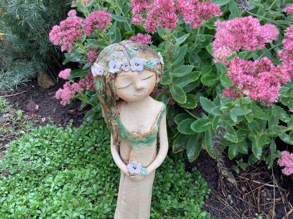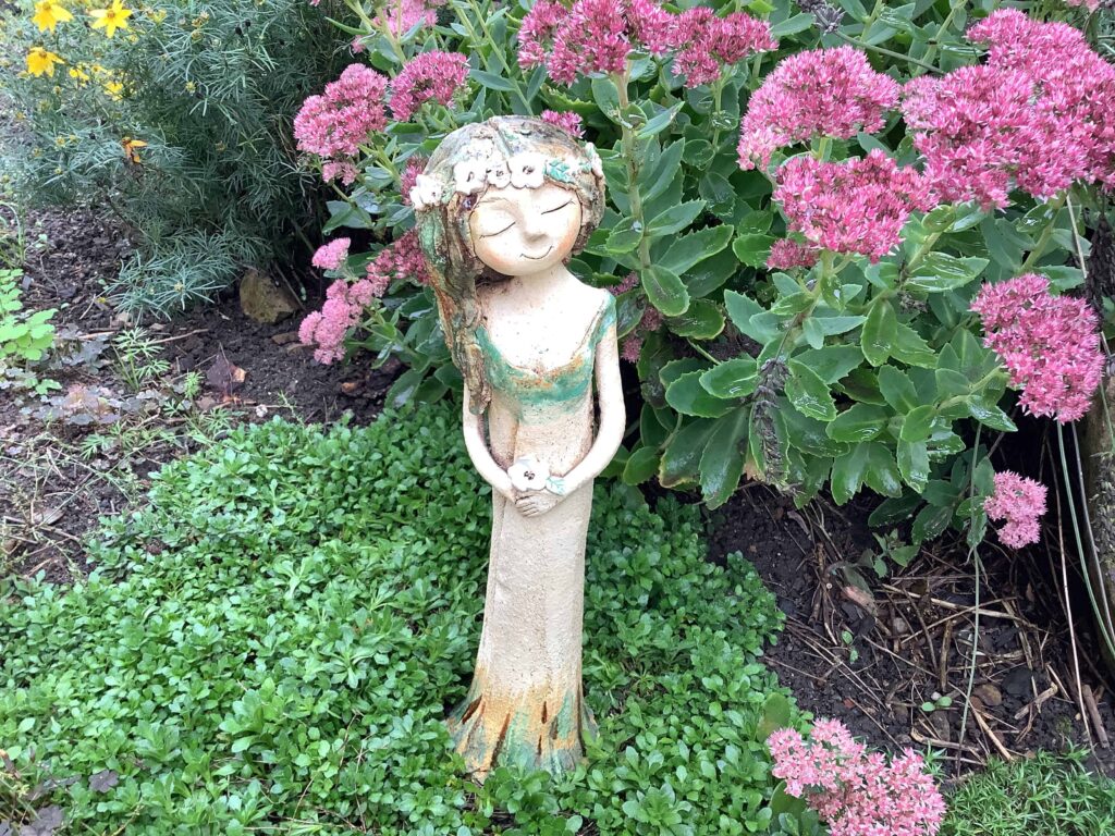 Výška cca 38cm. Mé oblíbené víly, ženy lesa, znikly na některé z mých procházek lesem, někde v mém nitru se zrodily jako pocit, když ještě rosou zkrápená stébla tráv vás studí na nohou a vy současně vdechujete vůni jehličí a v uších slyšíte šustit listí… tak tato krajina je nejbližší lesním vílám. Tady žijí a dohlížejí na stromy, kvetoucí louky a všechny rostliny, aby rostly, kvetly a sílily. A tento kousek krajiny si společně s nimi můžete přiblížit domů, do vaší zahrady či terasy.