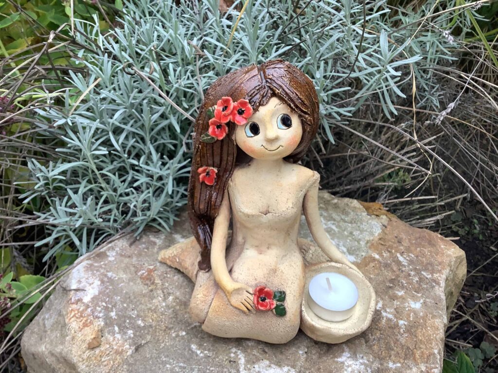 Víla je vysoká cca 18cm. Její vlásky zdobí kvítky vlčích máků a na rameni jí sedí malý ptáček. Líbit se jí bude u vás doma, na terase a klidně i v zahradě (na zimu doporučuji schovat).